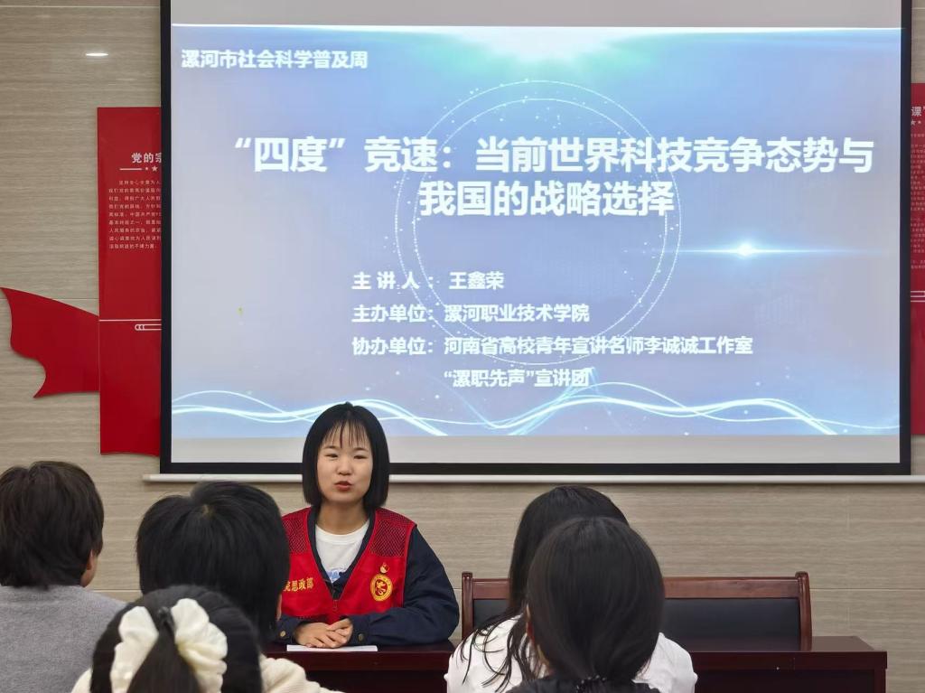 为深入贯彻落实漯河市委宣传部、漯河市社科联《2025年漯河市社会科学普及周实施方案》文件要求,进一步推动我市社会科学普及工作提质增效,9月19日下午,suncity太阳新城宣讲团走进双龙社区,以《“四度”竞速:当前世界科技竞争态势与我国的战略选择》为主题开展党的创新理论宣讲活动。本次活动由太阳集团城官网主办,河南省高校青年宣讲名师李诚诚工作室和“漯职先声”宣讲团协办。